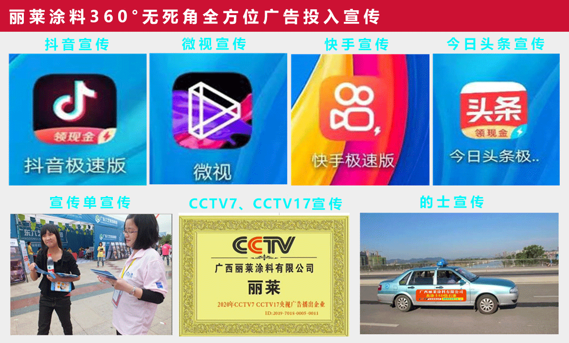 麗萊涂料持續(xù)投入數(shù)千萬元,在央視、地方衛(wèi)視、報紙、雜志、戶外路牌等各大傳統(tǒng)媒體進行不間斷的形象廣告宣傳,在全球知名的阿里巴巴、新浪、網(wǎng)易、搜狐、慧聰、鳳凰網(wǎng)、中國建材網(wǎng)等新媒體進行全方位立體式傳播,關(guān)注健康生活,關(guān)注環(huán)保建設(shè),迅速提升品牌知名度和美譽度。